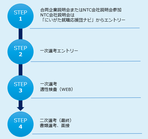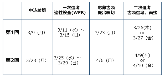 | 注意事項 | ※応募締め切り後に適性検査URLをご連絡いたします。 ※適性検査は受検期間内に受検してください。 ※一次試験に合格した方は期日までに必要書類をお送りください。 ※成績証明書が間に合わない場合は、履歴書と個人情報の取扱に関する同意書を先にお送りください。その後、準備が出来ましたら成績証明書をご提出ください。 |
