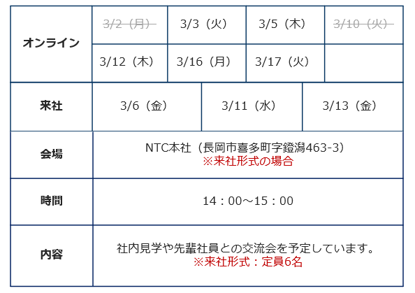 | 2026年3月4日(水) | にいがた就職応援団 就職縁日 朱鷺メッセ 13:00~17:00 |
